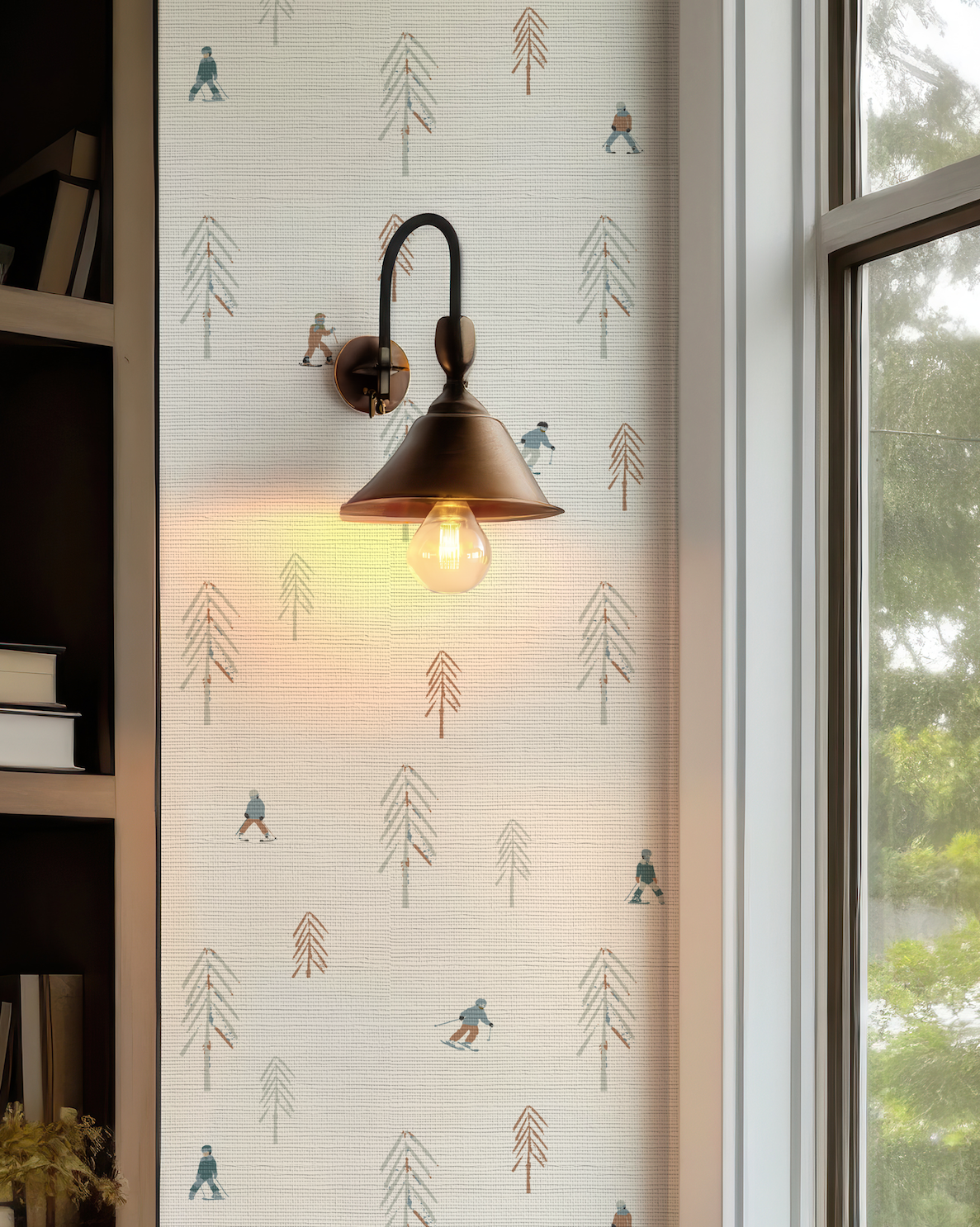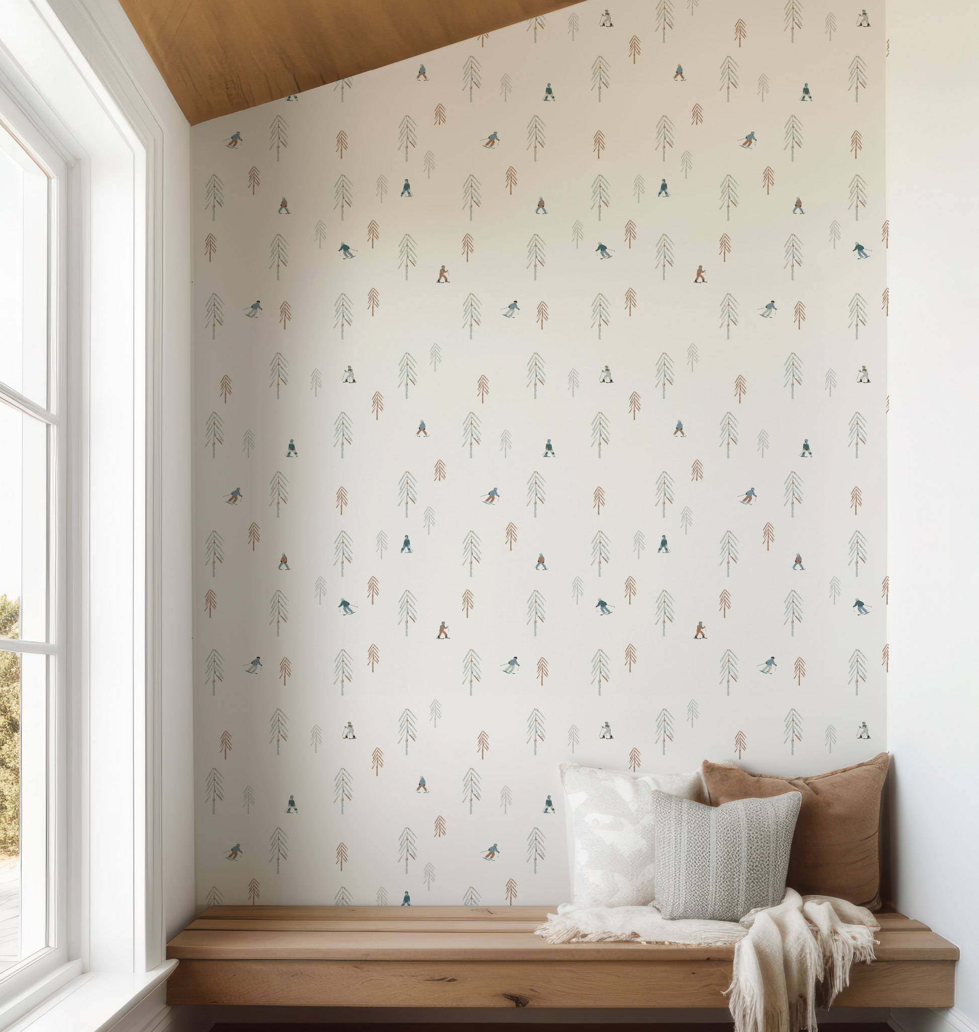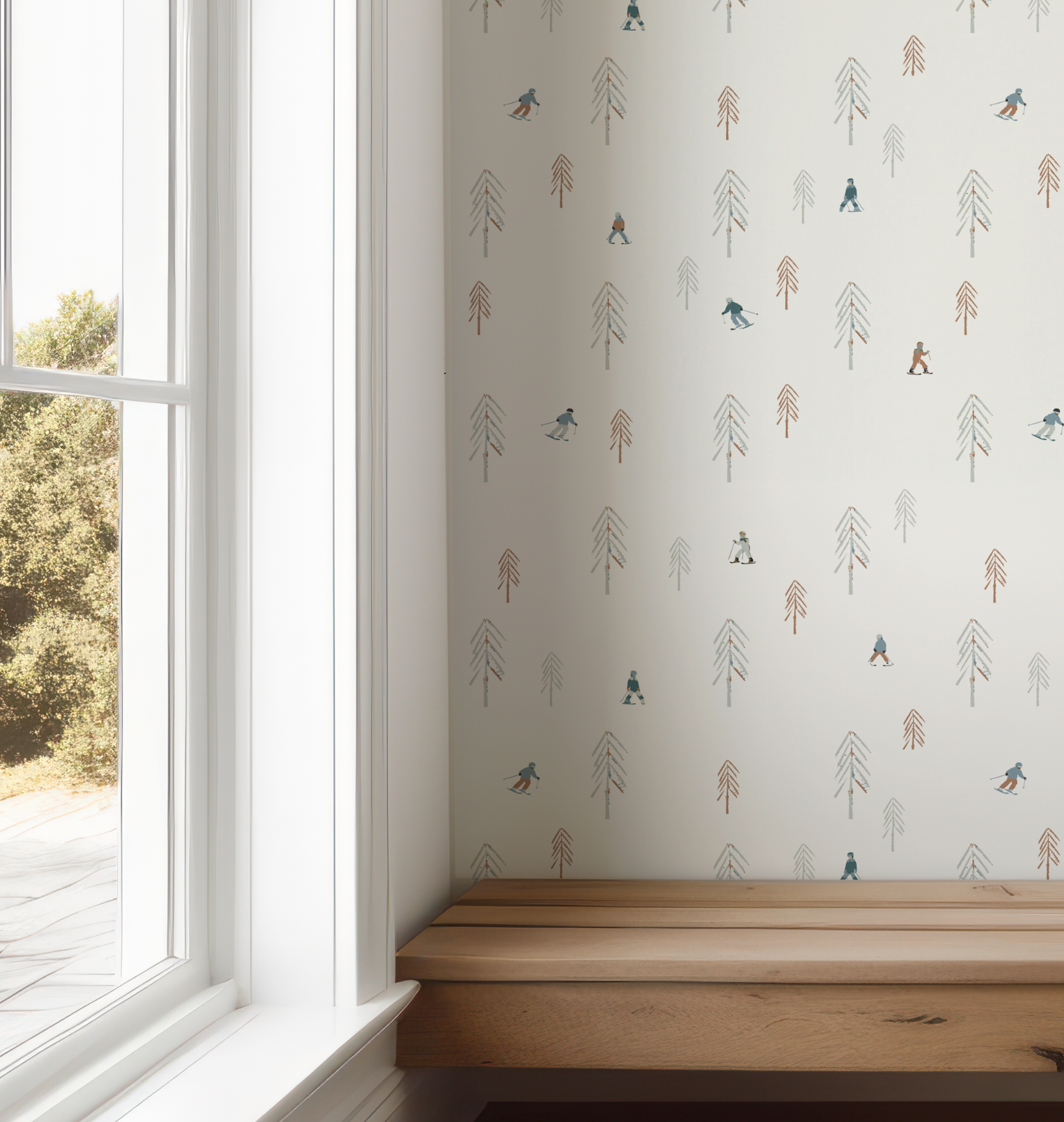 Bring a joyful atmosphere and a dash of energy to your home with our hand drawn skiers and painted pines. Ski Day Wallpaper is the perfect choice for your cozy interior!