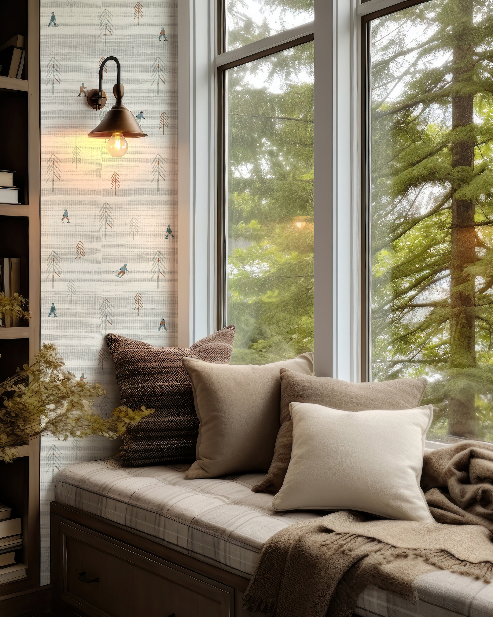Our Ski Day Wallpaper has a new color way featuring tonal blues, grays, greens, and a warm accent color to top it off.