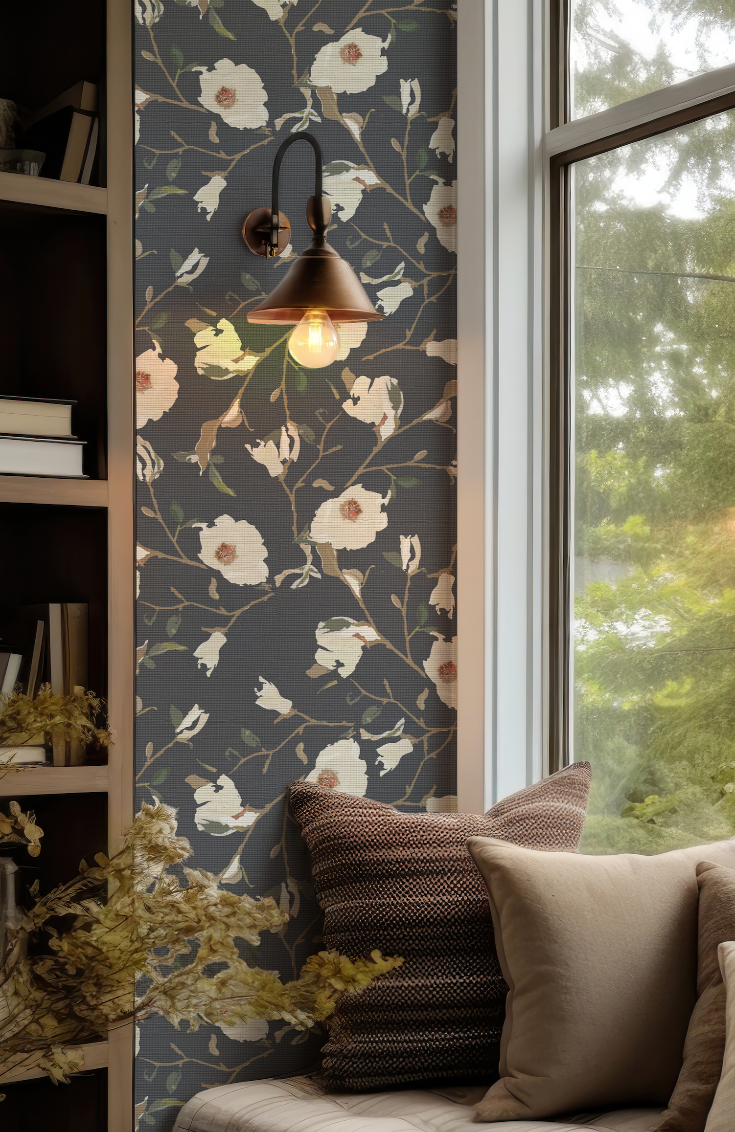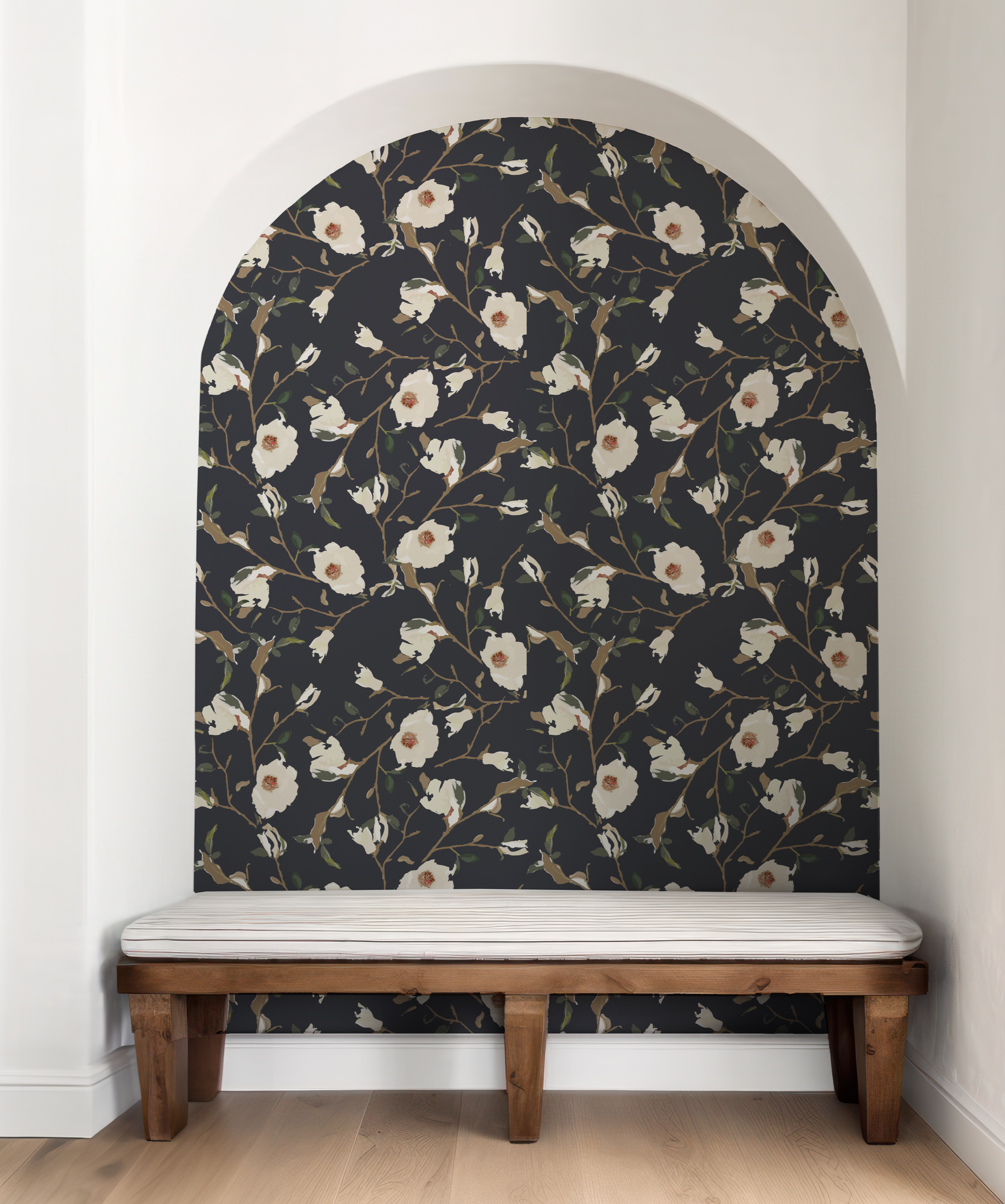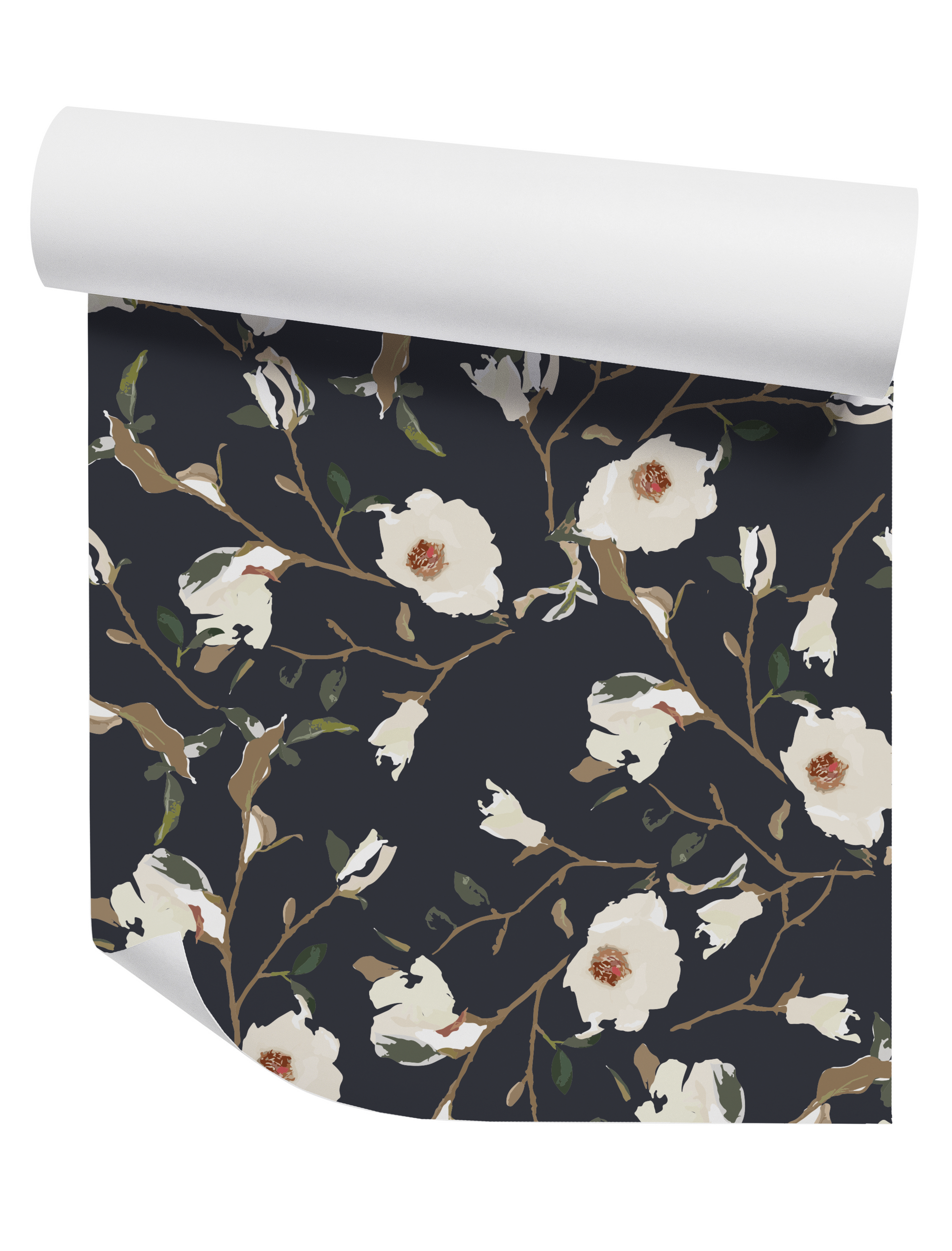 Transform any room with our Magnolia Navy Wallpaper Crafted by Willow+Wild. This wallpaper features an eye-catching painted floral of gorgeous tonal hues against a navy backdrop, creating a chic and stylish look that will bring a luxurious touch to your décor. Make a bold statement with this stunning wallpaper!